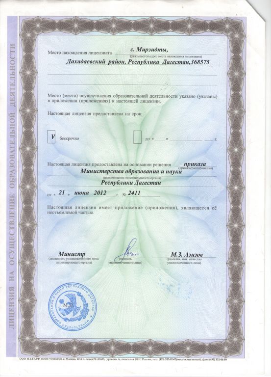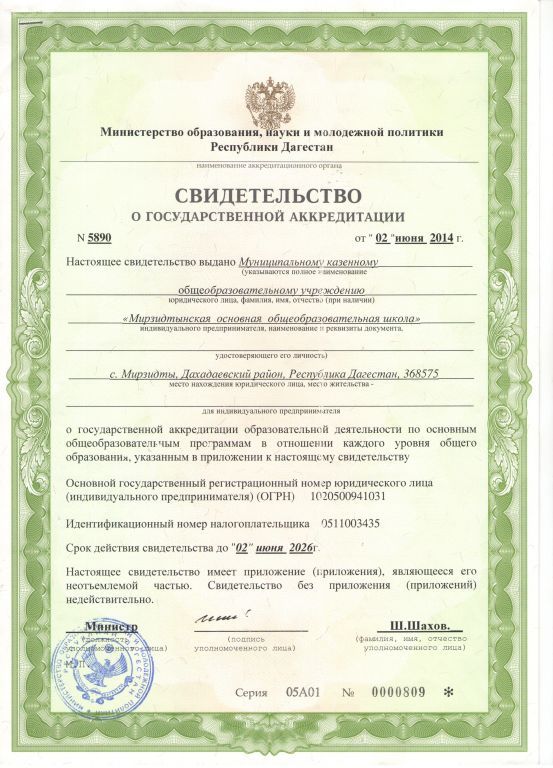 | Адрес местонахождения образовательной организации* | 368799, Республика Дагестан, Дахадаевский район, с. Мирзидты, улица Школьная, 1 А |